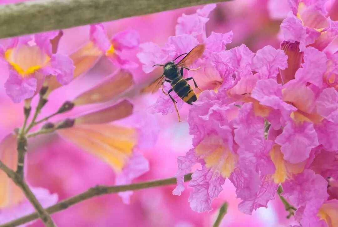 走出沙涌站D口,会被一片粉紫撞入眼底。几株紫花风铃木挺拔而立,繁茂的花朵缀满枝干,几乎不见一片青叶,像一串串紫色风铃垂挂枝头。