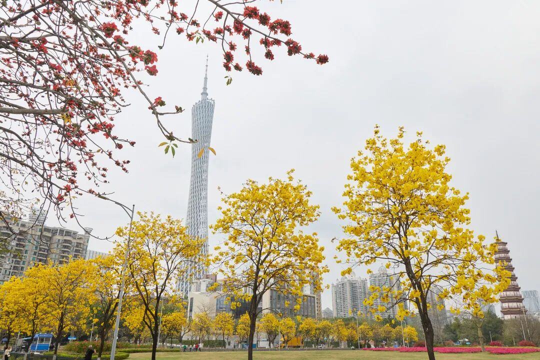 比起人潮拥挤的网红打卡地,赤岗塔下的黄花风铃木更显静谧惬意。这里可以拍到黄花风铃木与赤岗塔、广州塔同框的画面,金黄花海与现代都市地标神奇同框,随手一拍都是治愈系大片。