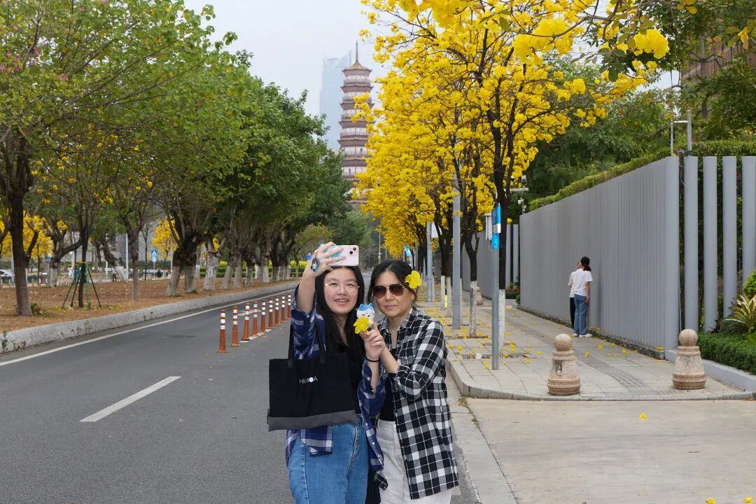 ▲ 海珠区友邻三路附近,市民在黄花风铃木树下打卡。