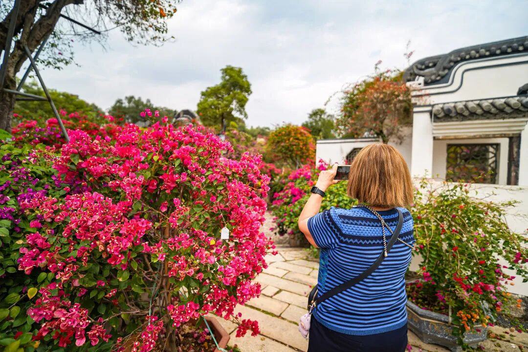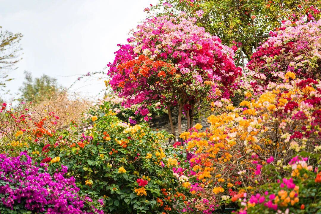 园内栽种火焰红、柠檬黄、冰雪白等各色三角梅,每年的盛花期时,藤蔓如瀑垂落、花墙层叠怒放,满园炽烈如霞。