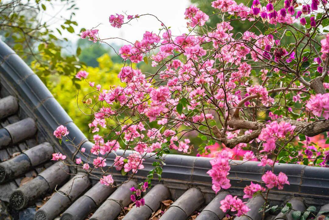 岭南镬耳墙、镂空花窗、青砖黛瓦掩映于三角梅花海之中,古典庭院与自然野趣碰撞出独特美学。