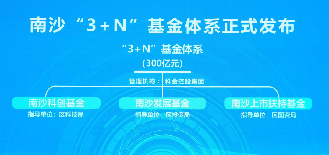 大会上,南沙“3+N”基金体系正式发布。该体系预计目标总规模超300亿元,由南沙科创基金、南沙发展基金、南沙上市扶持基金三类核心基金构成,分别由科技局、投促局、国资局进行指导,南沙科金控股集团管理运作。安排不超过1亿元的资金支持天使轮项目投资,重点培育港科广、中科院等重点院校孵化项目。
