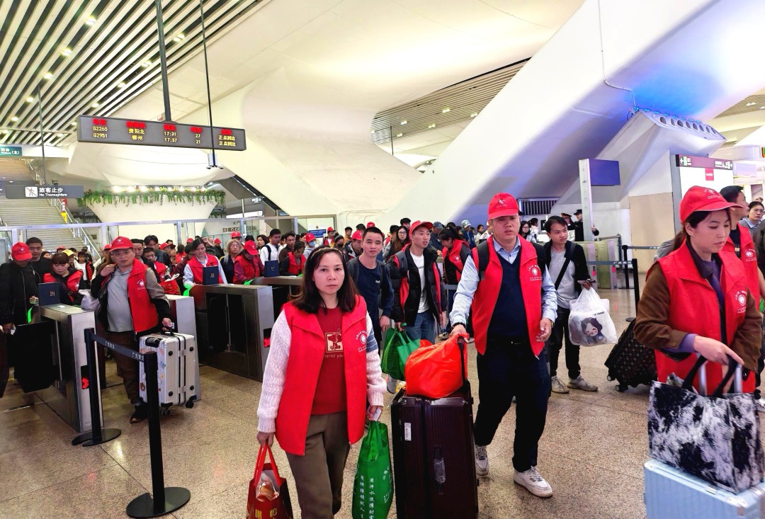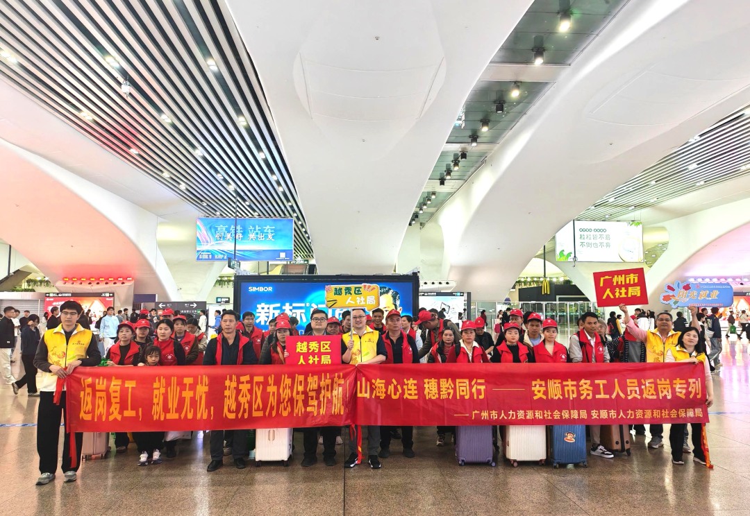 G2265次“山海心连・穗安同行”免费返岗专列近日从贵阳北站顺利抵达广州南站,广州越秀区人力资源和社会保障局组织专人到站迎接190名贵州籍务工人员返岗复工。