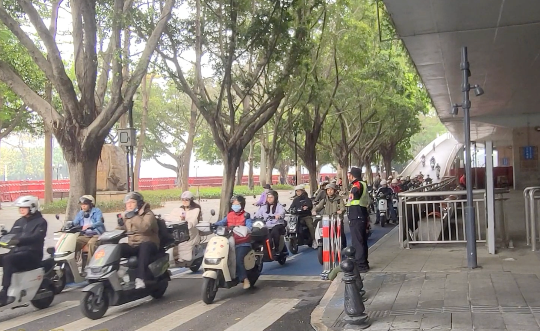 广州交警在越秀区沿江东湖路口采取“人防”+“物防”+“技防”三位一体的治理模式,全方位守护电动自行车通行安全,提升路口通行效率。