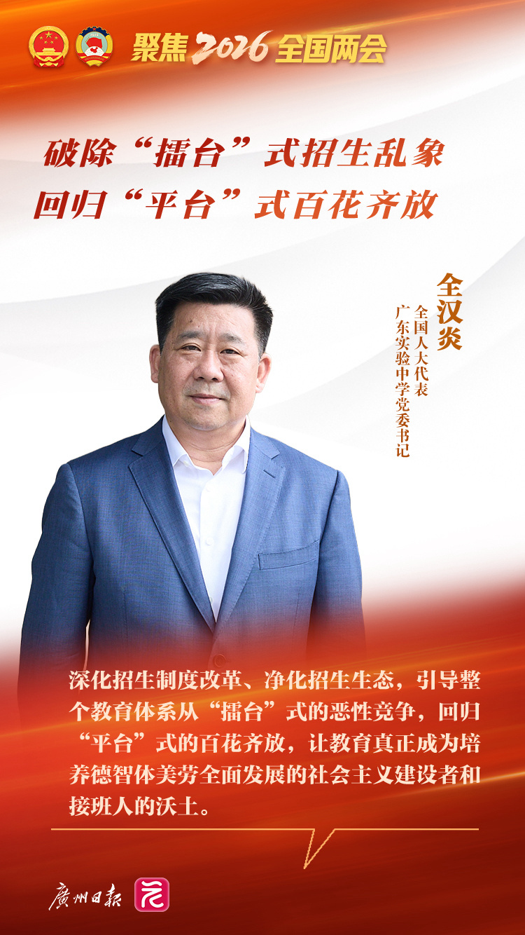 2026年全国两会召开在即。今年,全国人大代表、广东实验中学党委书记全汉炎将履职重点聚焦在大中小学招生生态问题上。全汉炎认为,招生问题看似具体,实则深刻影响着整个教育体系的健康运行和价值导向,关乎“为党育人、为国育才”的初心使命。他建议,应深化招生制度改革、净化招生生态,引导整个教育体系从“擂台”式的恶性竞争,回归“平台”式的百花齐放,让教育真正成为培养德智体美劳全面发展的社会主义建设者和接班人的沃土。