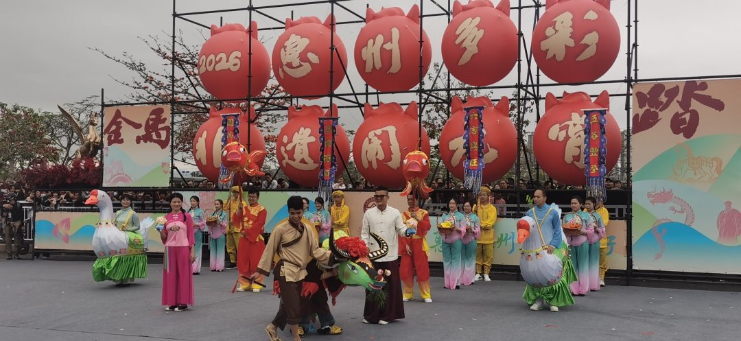 金马踏春闹元宵 非遗巡游耀鹅城。3月1日(正月十三)上午10时,随着一阵激昂的鼓点,备受瞩目的“金马踏春”——2026惠州多彩非遗闹元宵大巡游在美丽的东江河畔盛大启幕。近1300名非遗代表性传承人和表演者组成的文化长龙,沿着2.3公里的风景线踏歌而行,为市民游客献上了一场集观赏性、参与性、文化性于一体的元宵文化盛宴。