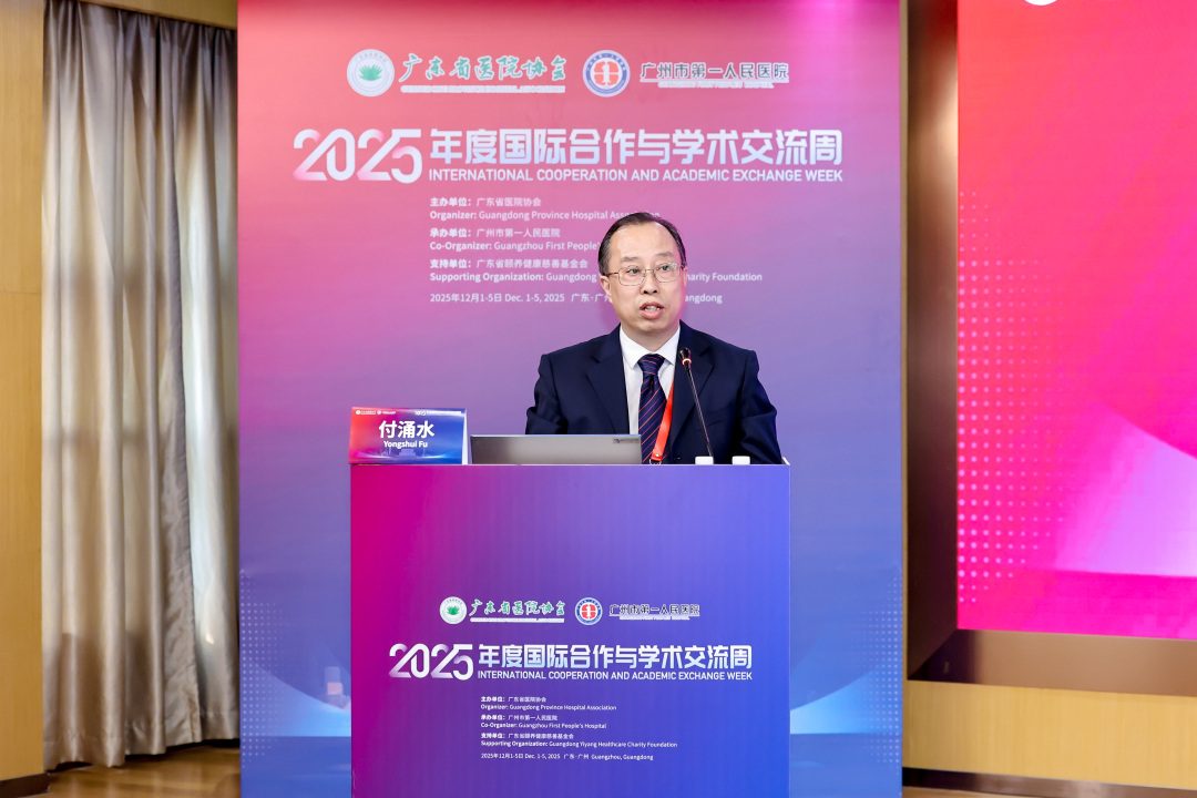 付涌水推动医院搭建国际学术交流平台,构建全球合作网络,图为其为2025年医院首届国际合作与学术交流周致辞。