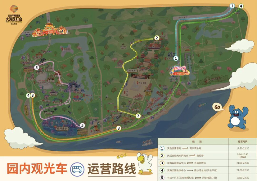 4.灯会园外接驳车线路已取消;园内白天交通接驳车路线(南沙湾总站至天后宫售票处)取消,夜间交通接驳车线路保留,敬请周知。