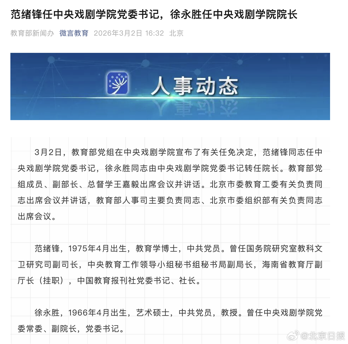 据微言教育消息,3月2日,教育部党组在中央戏剧学院宣布了有关任免决定,范绪锋同志任中央戏剧学院党委书记,徐永胜同志由中央戏剧学院党委书记转任院长。