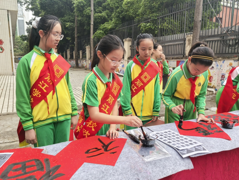 南村镇梅江小学的开学礼巧设萝卜、甘蔗谐音礼,寓意“白白胖胖”“掂过碌蔗”,还设有书法摊点挥毫送福,见字如面,福满梅江。