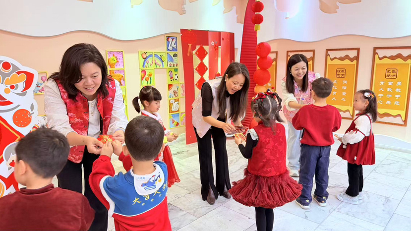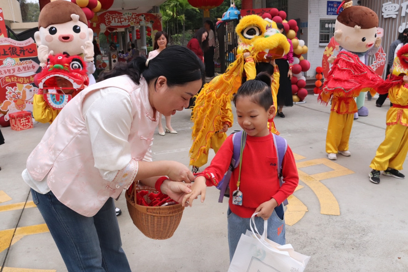 番禺区北城幼儿园以“福马临门,新春纳福”为主题,迎接孩子们快乐返园。现场设置“祝福投投乐”传统游戏,小朋友们将写满心愿的纸飞机投向靶心,在趣味互动中体验非遗;园长、老师们身着岭南特色服饰,为幼儿派发寓意吉祥的利是,传递新春祝福。