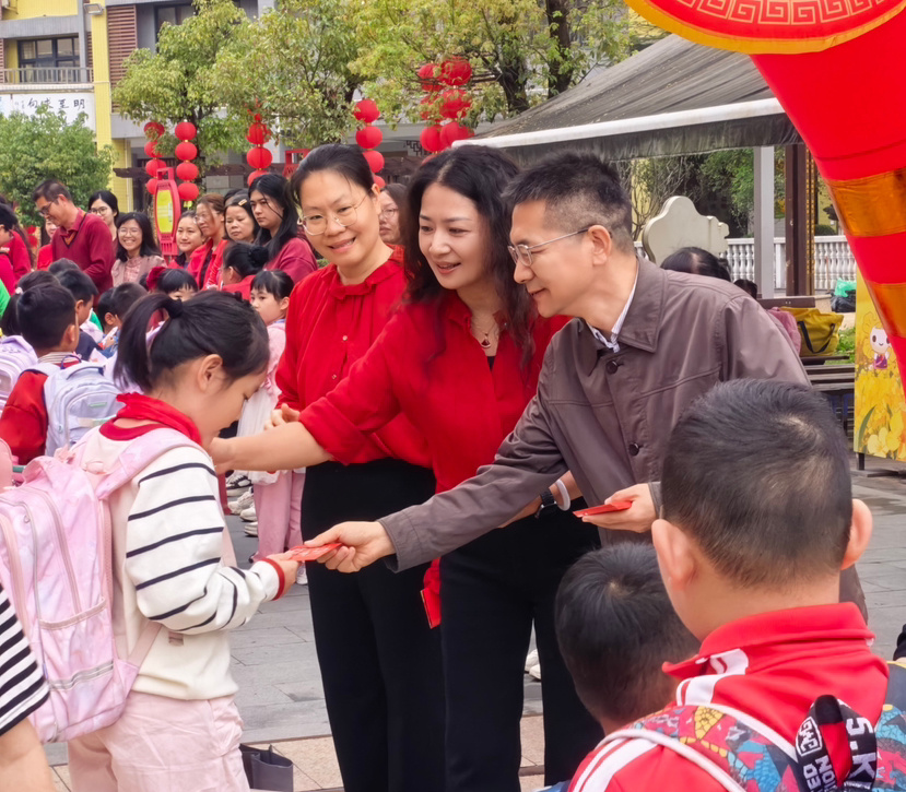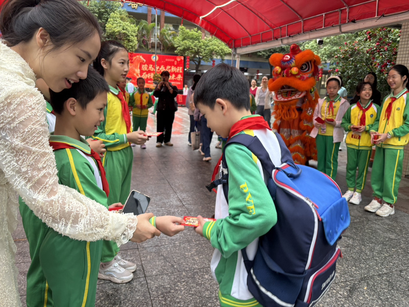 东城小学大队委和老师在校门口为同学们派发新年红包,里面装有全体老师准备的小礼物。小广场上锣鼓喧天,一红一金两只“狮子”踩着欢快鼓点,时而威武腾跃,时而俏皮眨眼,引来孩子们阵阵惊叹与欢笑。广场一侧的长桌上,陈列着同学们寒假制作的“年”文化手工作品——书法、春联、窗花、泥塑小马、红包灯笼……一件件充满童趣的作品,与舞动的狮影相映成趣,共同构成开学首日鲜活的新春图景。