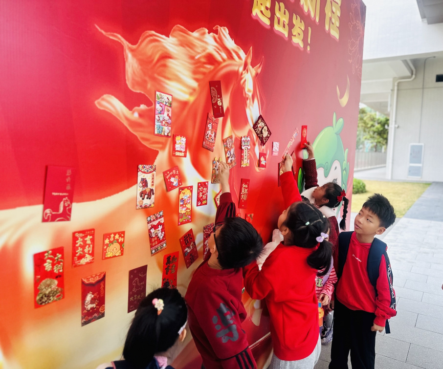 广东番禺中学教育集团兴南学校设置了一面“红包寄语墙”,孩子们将亲手制作的心愿红包贴满骏马图案,让童心与期盼,化作一匹载满梦想的“心愿之马”。