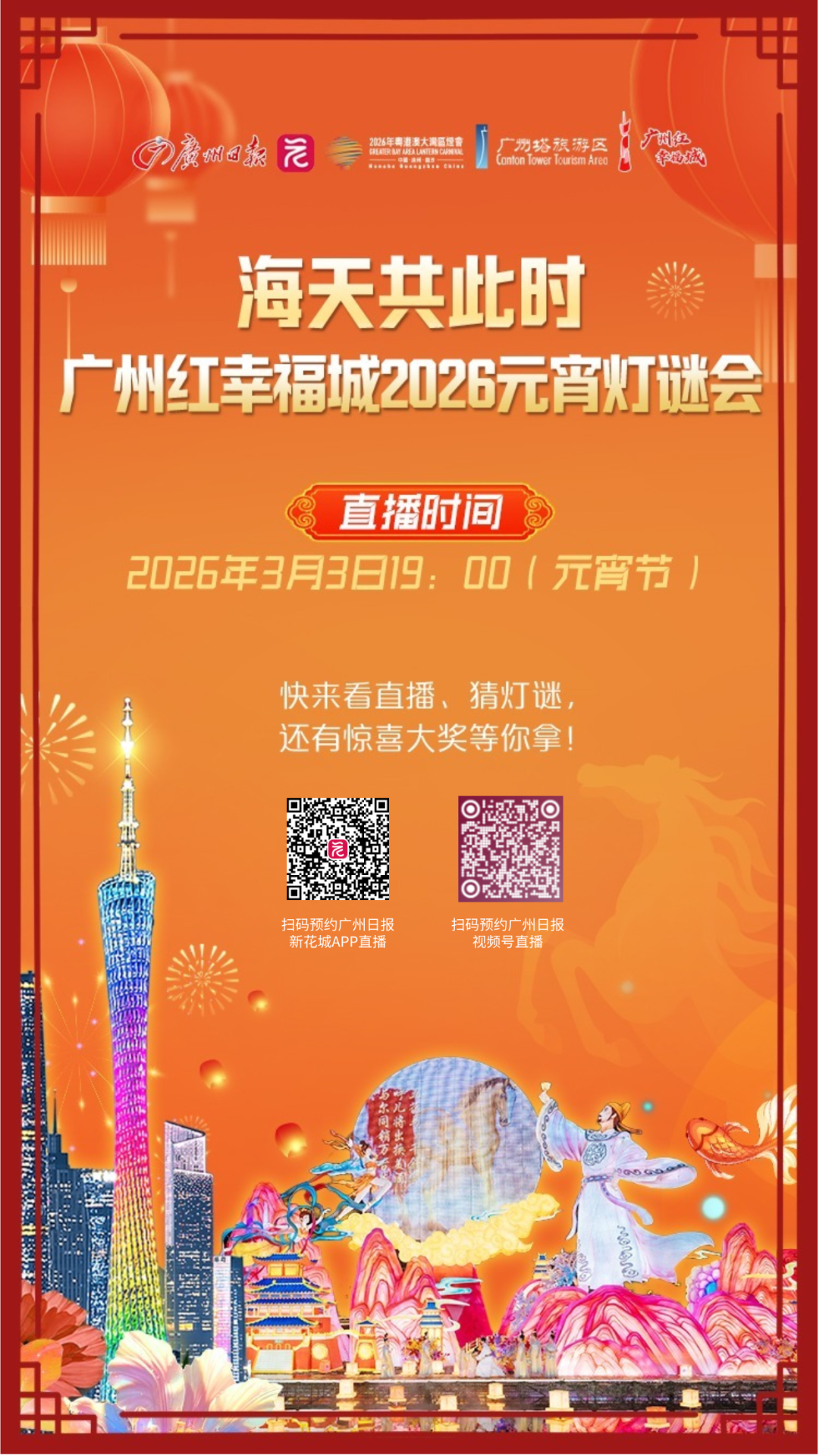抽奖方式二:关注广州日报微博和视频号官方账号,3月3日19时起观看直播“广州红幸福城2026元宵灯谜会”参与猜灯谜,有机会赢取广州塔门票、粤港澳大湾区灯会门票、广州塔法国旋转餐厅双人下午茶等奖品哦!