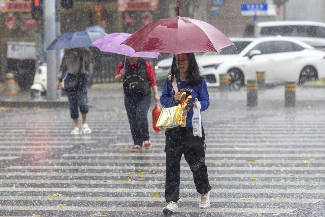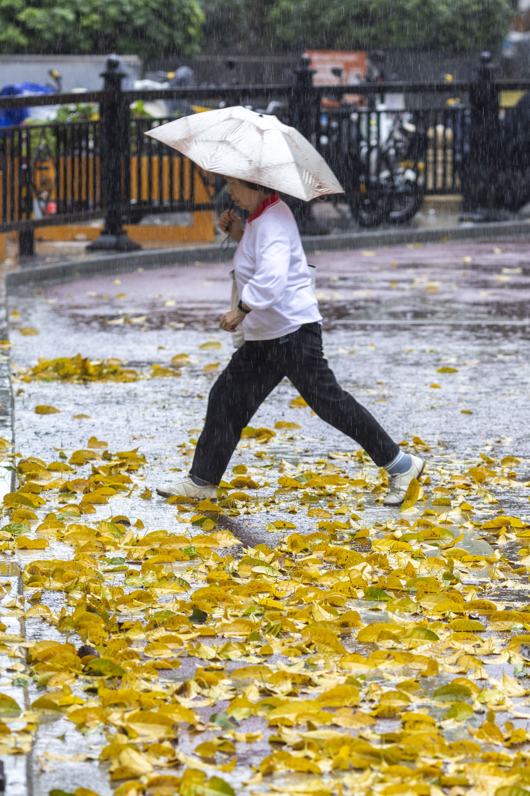 海珠区江南大道北,市民在大雨中撑伞过马路。