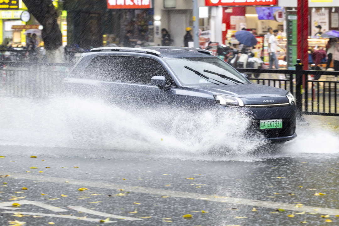 暴雨造成马路短暂积水,车辆驶过溅起水花。