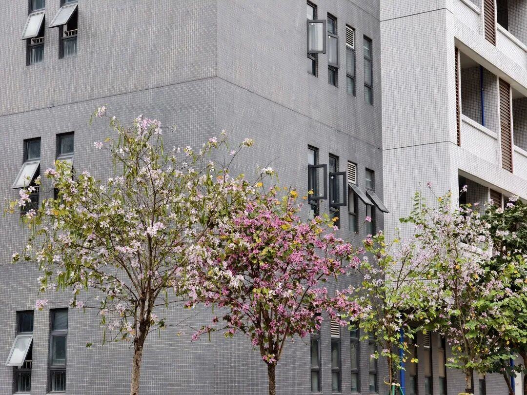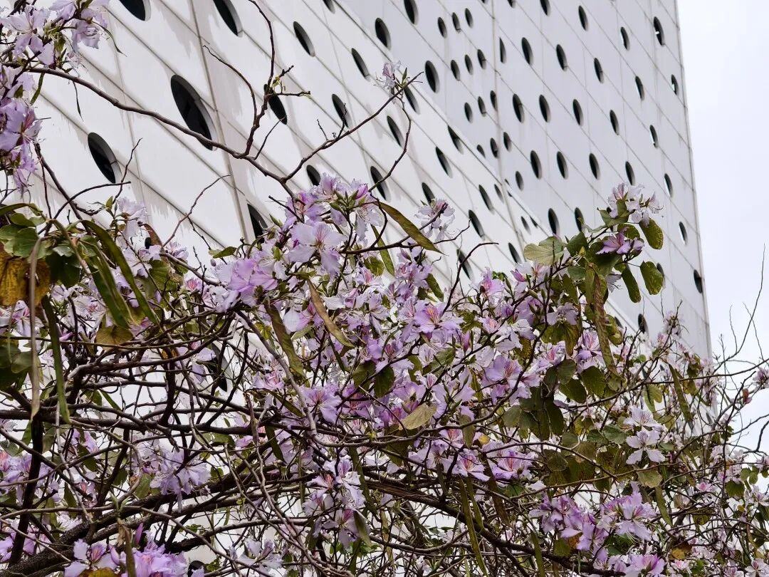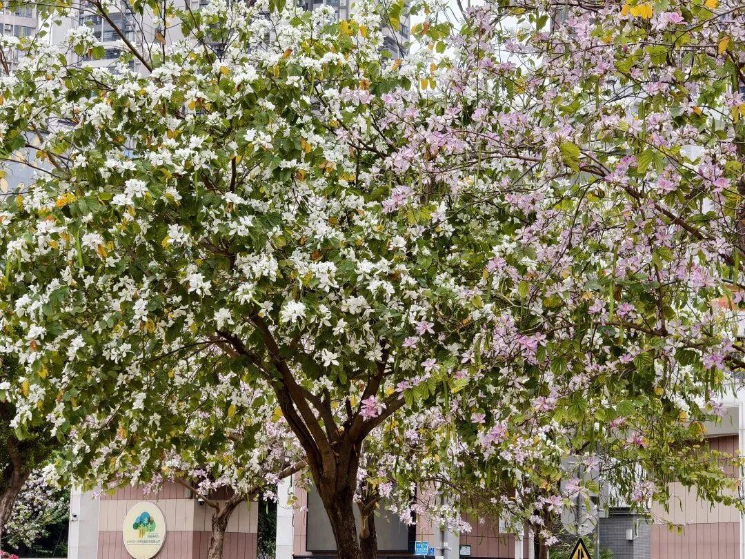 路边的紫荆花一簇簇开着,