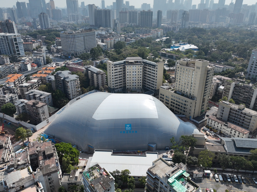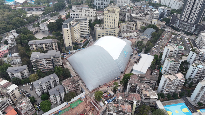 “气膜相当于为基坑披上了一套由高强度膜材与智能钢缆织就的‘外衣’,内部结构无梁无柱,空间开阔。”施工单位中建四局的工程师介绍。这层“智能皮肤”能隔绝99%扬尘,降低噪声超40分贝,将施工噪声降至60分贝以下。