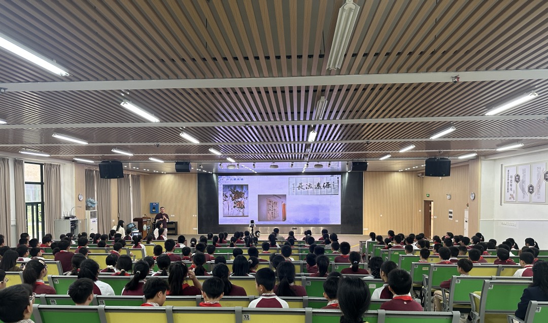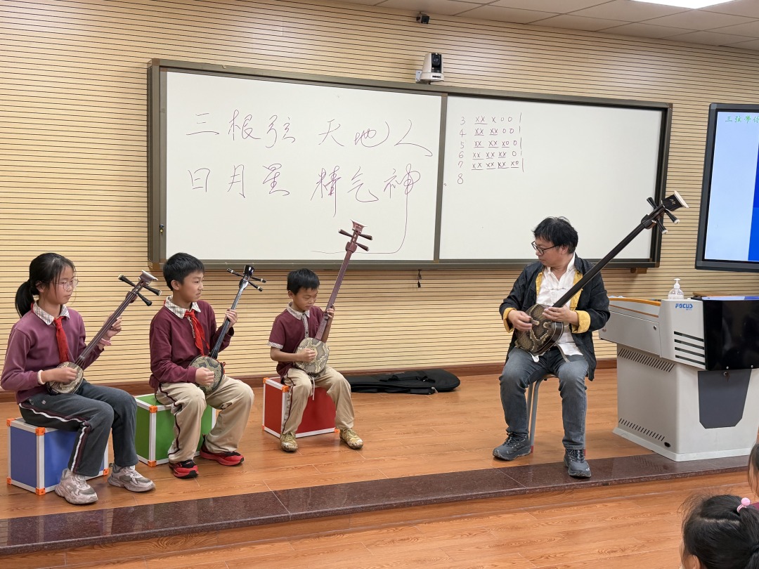 活动当天,五所学校同步开启非遗盛宴,不同品类的非遗代表性项目各展风采,让孩子们在近距离接触中沉浸式感受传统文化的深厚底蕴。香洲区第二十一小学内,市级非遗岭南苏裱(装裱修复)技艺代表性传承人王芳登现场授课,讲解苏裱技艺的历史渊源与独特价值。现场孩子们认真聆听、积极提问,对传统装裱技艺充满好奇;金湾区领航小学的活动现场同样热闹非凡,珠海非遗推广大使周浩荣联同市级非遗白蕉客家竹板山歌传唱人吴宇宇带领师生走进非遗里的客家文化,了解客家民俗,学客家话,唱客家童谣,现场演绎了节奏灵动、感染力强的白蕉客家竹板山歌(以下简称“竹板山歌”),让孩子们体会到竹板山歌背后的文化内涵与人文情怀;斗门区珠峰实验学校内,金湾区非遗金湾柴烧陶传承人孙先军带来了独具特色的柴烧陶主题分享,介绍了金湾柴烧陶的百年历史及制作工艺,孩子们近距离欣赏到窑变结晶花的独特美感,对传统陶艺产生了浓厚兴趣;高新区金凤小学则开启一场市级非遗——三灶民间故事分享会,讲述人李遵新用通俗易懂的语言、生动形象地表达,将三灶岛和唐家的人文历史、地名故事首次跨地域联动,让孩子们在聆听中了解本土历史文化,感受口口相传的民间智慧,厚植孩子们的爱国情怀;万山区桂山小学内,市级非遗三弦演奏技艺传承人王学辉带来了一场精彩的音乐盛宴,生动演示了三弦的演奏技巧,让孩子们感受到传统乐器在新时代的创新活力。