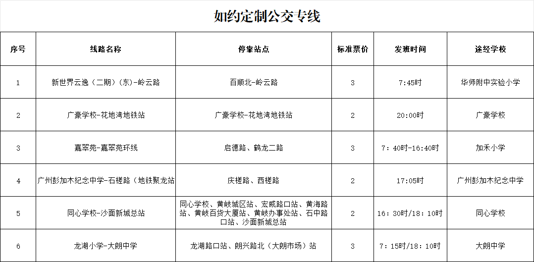 此次复行的6条如约定制公交专线,覆盖多个学校及周边社区,精准衔接学生家庭与校园、校园与地铁枢纽,最大限度缩短通勤时间,提升出行便捷度。其中,“新世界云逸(二期)(东)—岭云路”专线衔接社区与校园,方便周边学子就近乘车;“广豪学校—花地湾地铁站”“广州彭加木纪念中学—石槎路(地铁聚龙站)”两条专线,打通学子地铁换乘的“最后一公里”,解决通勤难题;“嘉翠苑—嘉翠苑环线”专线覆盖社区周边学子,实现短途便捷接驳;“同心学校—沙面新城总站”“龙湖小学—大朗中学”专线则精准对接两所学校学子的出行需求,让学子们无需中途换乘,轻松返校。