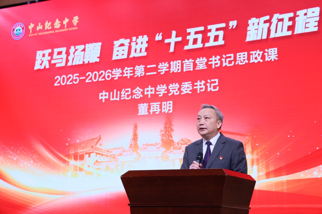 纪中是为纪念孙中山先生而创办的学校,2026年是孙中山先生诞辰160周年,在如此具有重要意义的时间节点,董再明呼吁所有纪中人传承红色基因,大力弘扬中山先生的爱国思想、革命意志和进取精神,牢记“立大志、做大事”的嘱托,将“振兴中国之责任,置之于自身之肩上”,在奋进“十五五”新征程上,跃马扬鞭、勇毅前行,以青春之我、奋斗之我,为强国建设、民族复兴伟业和祖国的和平统一贡献更加磅礴的纪中力量。