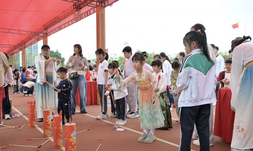 一旁的“市”区还原了热闹的广府市集。趣味“抓马”、寻俗探年、套圈圈、仿古礼射、称重挑战、钓锦鲤、投壶、汉服体验、黄啸侠拳法……十大摊位将传统游艺与商贸文化巧妙融合。在仿古礼射摊位,孩子们拉弓搭箭,感受传统射礼的专注与礼仪;非遗黄啸侠拳法体验馆里,传承人教授简单实用的防身动作,孩子们比划招式,有模有样。汉服体验馆里,身着各式汉服的家长与孩子穿梭拍照,仿佛穿越回古代商都。