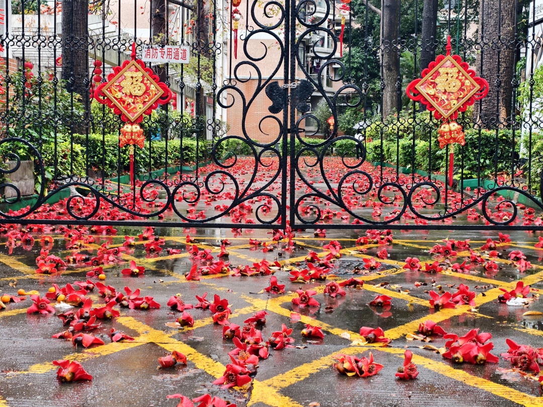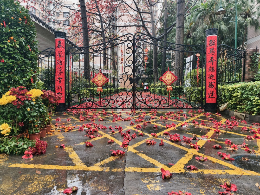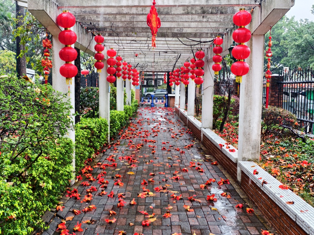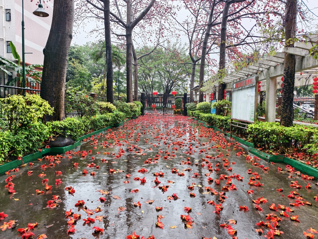 番禺区丽江花园康城居前,雨后掉落的木棉花与长廊的红灯笼相得益彰。
