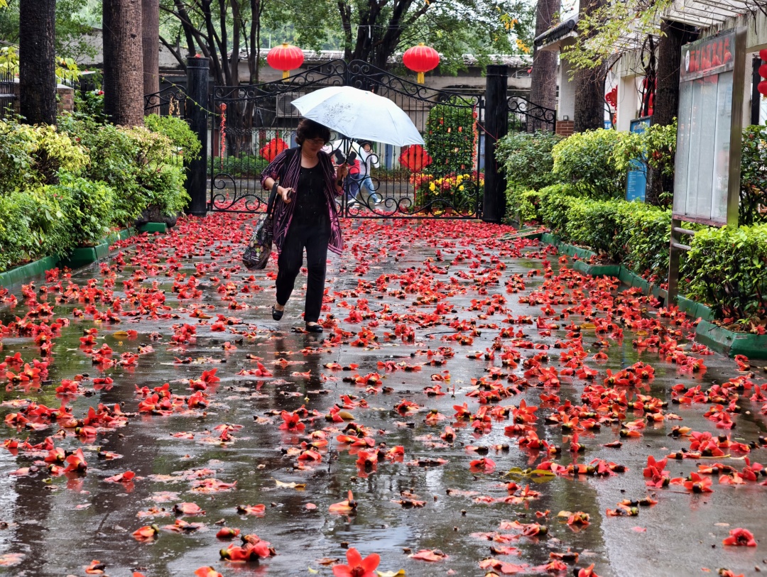 雨后掉落的木棉花铺满了地面,路人慢步走过。