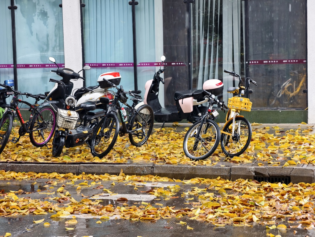 番禺区丽江花园另外一角,掉落的黄葛树叶堆满地上。