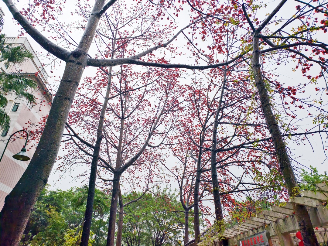 番禺区丽江花园康城居前的木棉花正值盛花期。