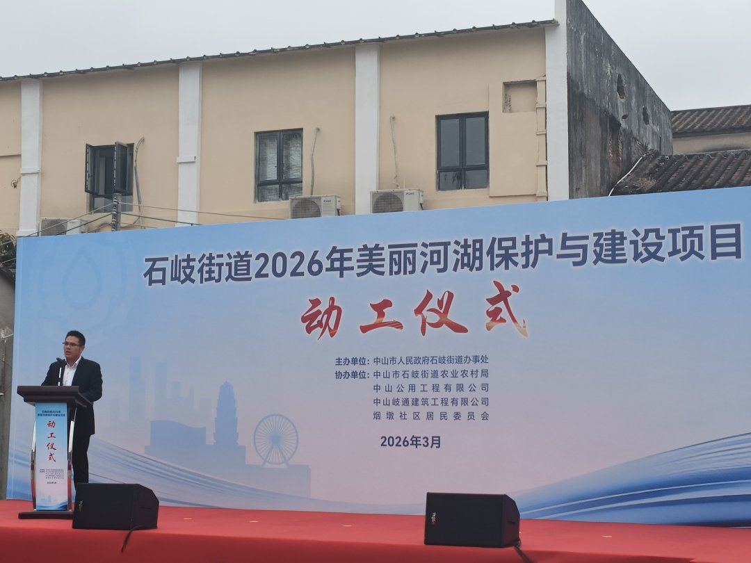 3月3日下午,石岐街道2026年美丽河湖保护与建设项目动工仪式在民生路停车场举行。本次动工仪式由中山市人民政府石岐街道办事处主办,街道农业农村局、烟墩社区居民委员会及相关建设单位协办。石岐街道党政领导班子成员、相关部门负责人、社区代表、施工单位及媒体记者等80余人参加活动。