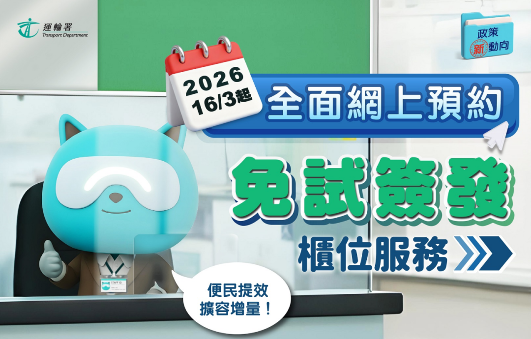 香港特區政府運輸署2日宣佈,由3月16起全面推行網上預約免試簽發香港正式駕駛執照(免試簽發)櫃位服務並增加預約名額,同時擴展服務至全部四間牌照事務處,進一步便利申請人及更有效運用資源,包括「粵車南下」內地司機駕駛證提交的申請。「電子即日籌」安排亦會於3月16取消。