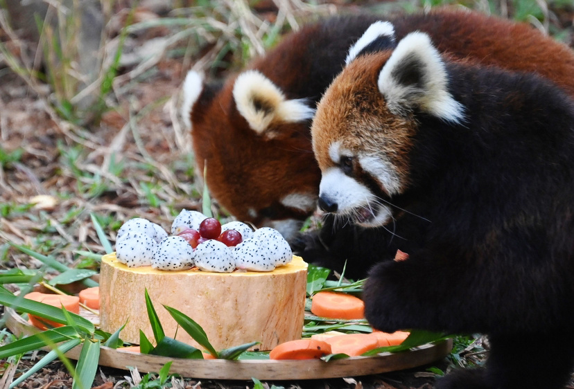 动物园饲养员精心为小熊猫制作了“水果汤圆”。圆形竹簸箕内铺上竹叶,中间圆盘以南瓜为原料做成,上面摆放火龙果、西瓜果肉做成的小圆子,再加入提子、苹果、熟蛋黄等圆形食物,寓意团圆美满。