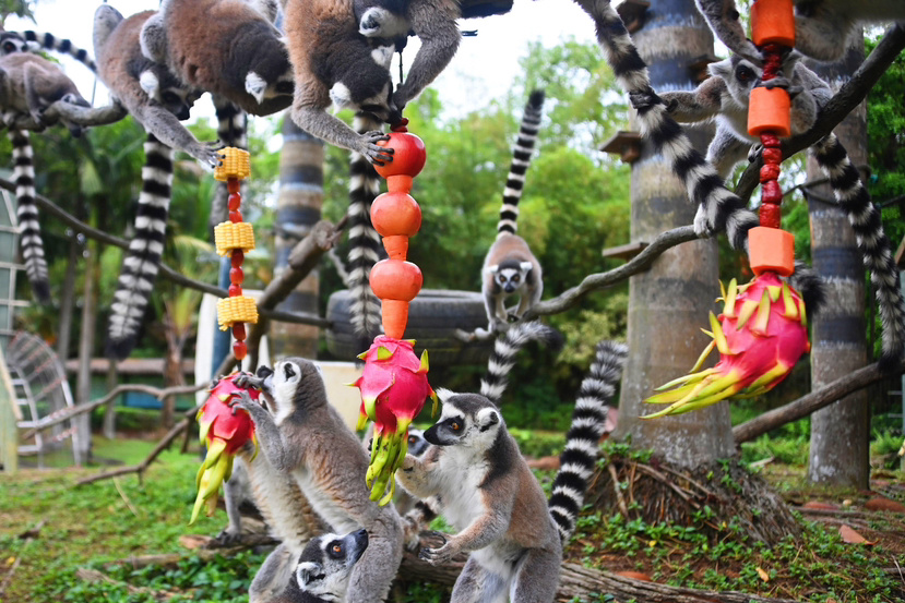除了吃“汤圆大餐”,动物们还活跃玩起了“花灯”。动物园饲养员用火龙果、提子、红枣、玉米、红萝卜等食物为环尾狐猴制作了“水果花灯”。环尾狐猴对新奇又喜庆的“花灯”爱不释手,一边吃着食物,一边玩着“花灯”,萌态十足,充满了喜气洋洋的氛围。