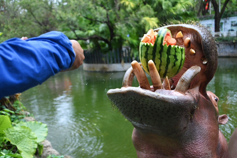 河马张开大嘴吞食整个“元宵美食”。动物园饲养员采用整只西瓜制作成“水果篮”,里面加入红萝卜、地瓜、苹果、苜蓿颗粒等食物。记者在动物园河马展区看到,在水中活动的河马察觉到饲养员手捧“水果篮”,河马庞大的身躯浮出水面,并缓缓走到岸边。美味的“水果篮”让河马不禁食指大动,虽然还未品尝,但已经让其垂涎欲滴。河马主动张开大嘴,饲养员把整个“水果篮”放入河马嘴里,河马“吧唧”地合上嘴,吃得津津有味。