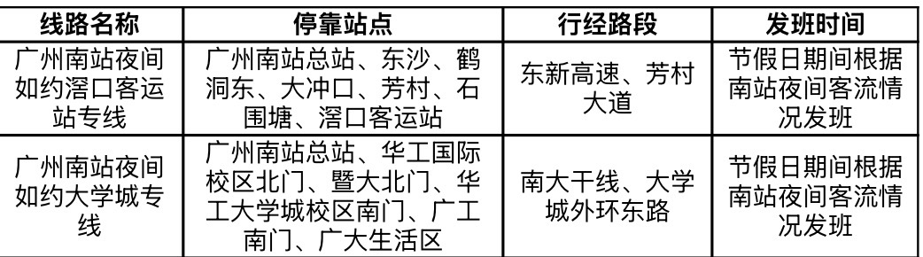 本次开行的两条夜间如约定制专线,均实行15元/人的统一票价,发班时间紧跟广州南站夜间实际客流灵活调整,全力保障旅客无需久等、出站即走,实现高铁与公交的无缝衔接,彻底告别夜间抵穗出行难的问题。具体线路信息如下: