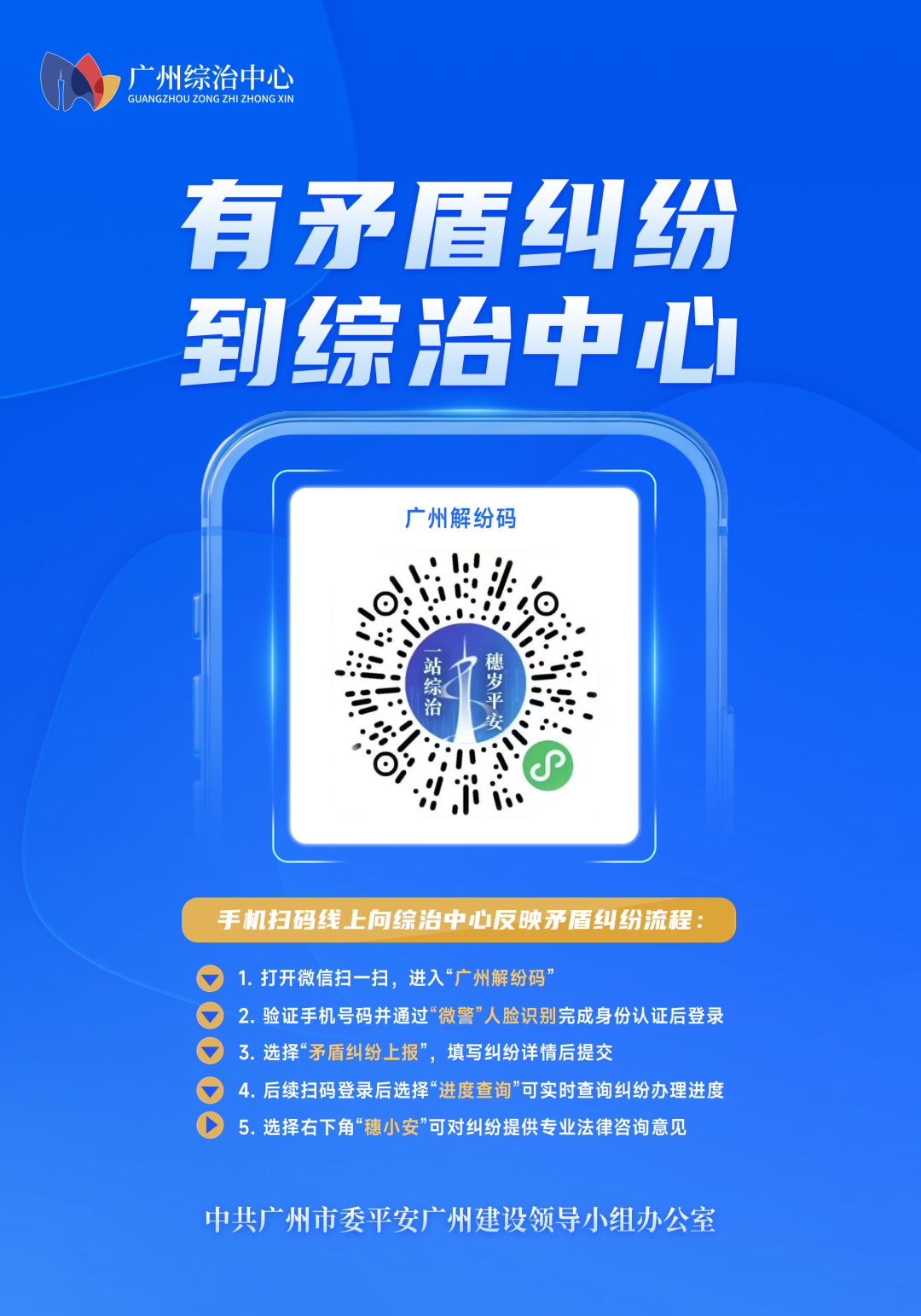 线下,市民群众可以留意社区张贴的“广州解纷码”,直接扫码反映矛盾纠纷诉求。线上,在“广州政法”微信公众号菜单栏找到“广州解纷码”直接扫码或者登录“穗好办”微信小程序搜索“广州解纷码”即可一键提交诉求。请放心,解纷码会按照相关法律法规收集和保护您的个人信息。