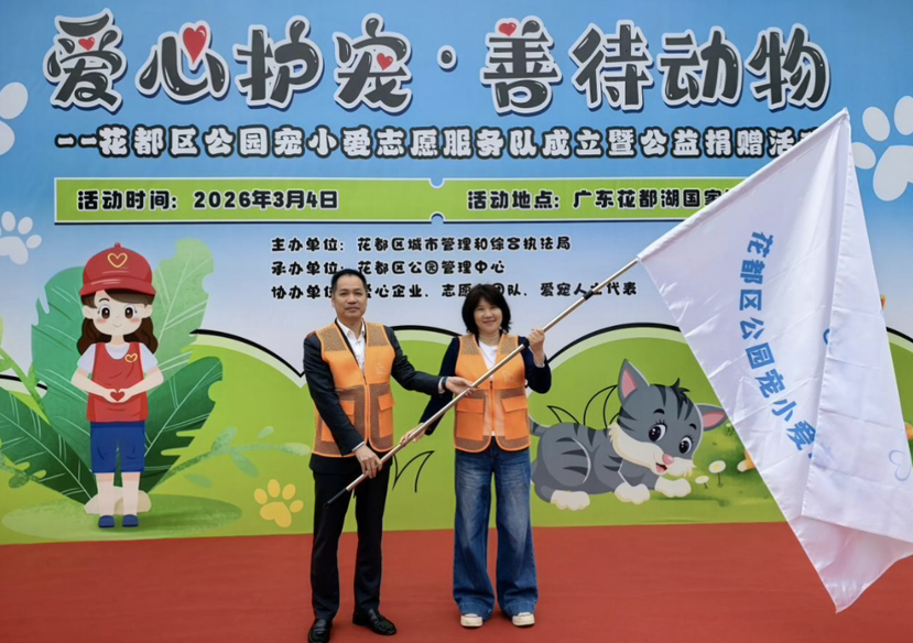 活动现场,花都区城市管理和综合执法局宣布宠小爱志愿服务队正式成立,并为队伍授旗。这支由热心市民、爱宠人士及社区志愿者组成的队伍,将以“文明养宠引导、公园环境维护、流浪动物关爱、公益科普宣传”为核心任务,常态化开展流浪猫投喂巡查、文明劝导、科学养宠知识普及等志愿服务。