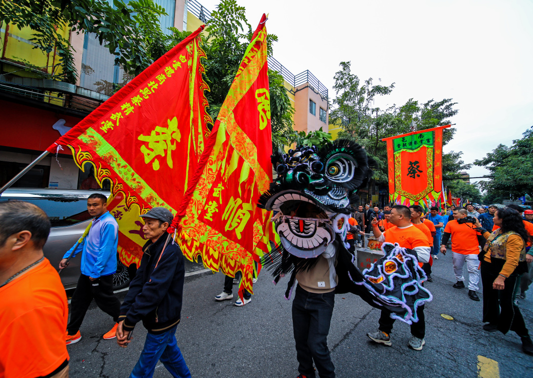 下午由长老代表、旗队、醒狮等组成的巡游队伍高举祖传大标罗伞、彩旗罗帐,伴着八音锣鼓绕村而行,队伍绵延数百米,气势恢宏。