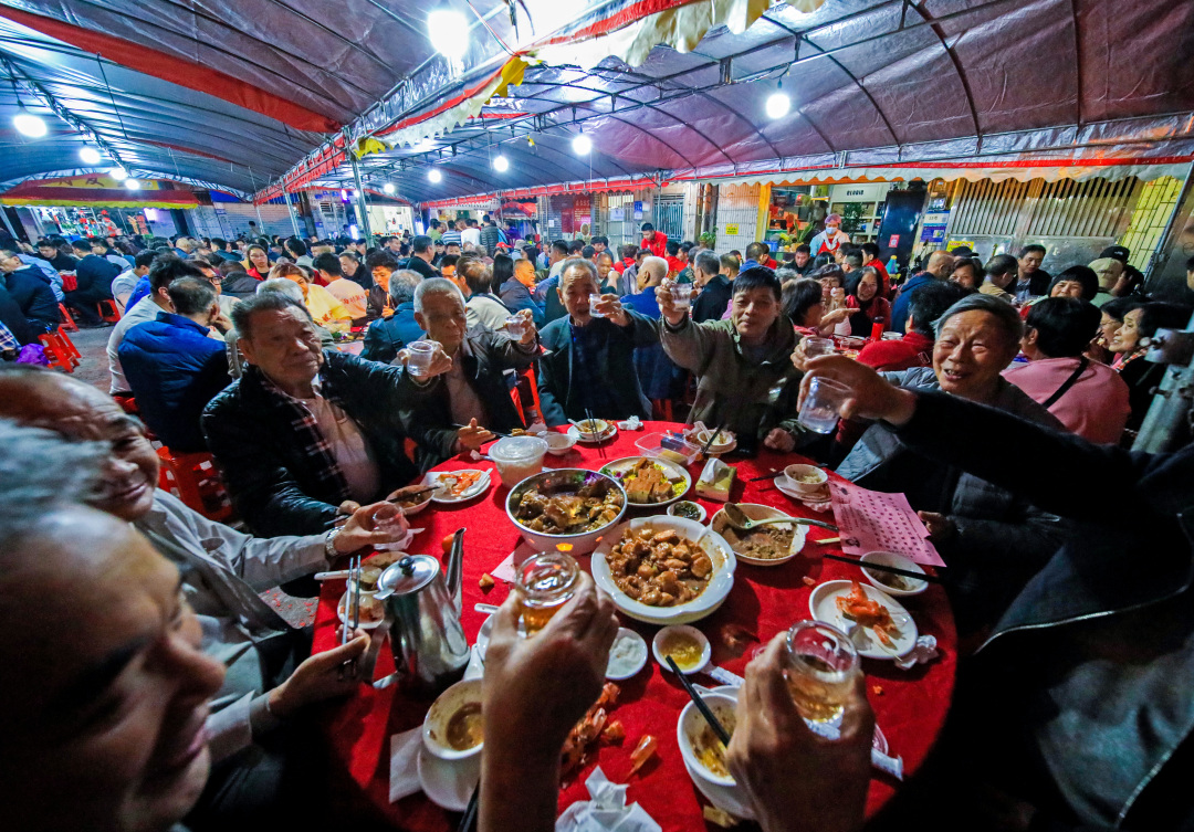 祠堂家宴是祠堂庙会的重头戏。瑶台村、王圣堂村分别筵开百席,村民们欢聚一堂、共话团圆,餐桌上“瑶台三宝”——象征着丰收和幸福的扣肉、象征着富饶和繁荣的冬菇、象征着平安和祥和的鱼蛋香气四溢,这些传统菜肴由本村村民掌勺烹饪,原汁原味还原广府家宴风味。宴席上,邻里畅叙乡情、共话发展,在烟火气中凝聚亲情、增进认同,让祠堂庙会成为联结乡情、传承文脉的重要载体。