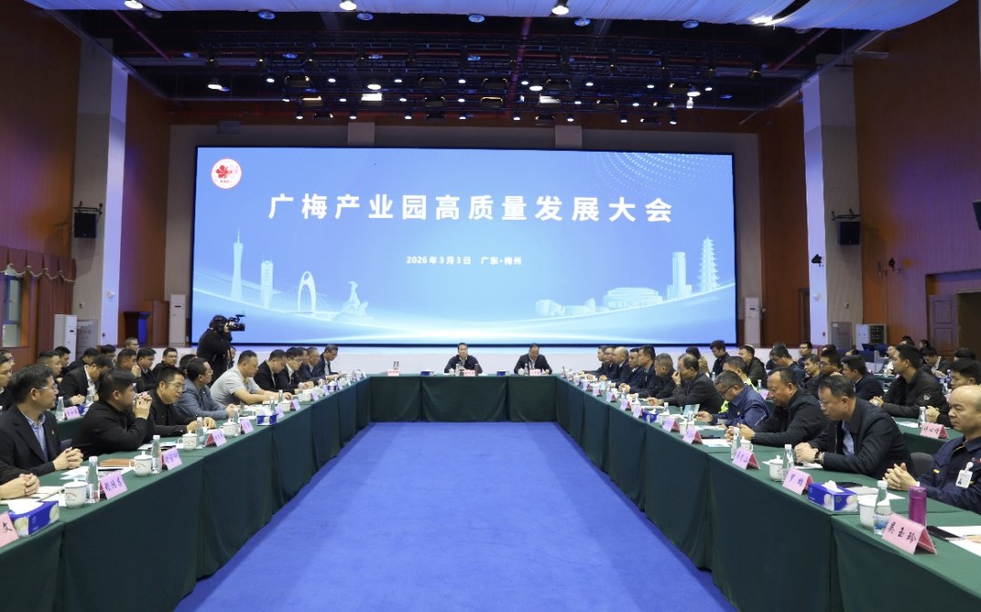 3月3日下午,广梅产业园高质量发展大会在梅州市广梅产业园绿创中心召开。会议传达学习省、市高质量发展大会精神,总结2025年广梅产业园经济发展成效,部署2026年重点工作,动员园区上下凝心聚力、乘势而上,奋力谱写高质量发展新篇章。