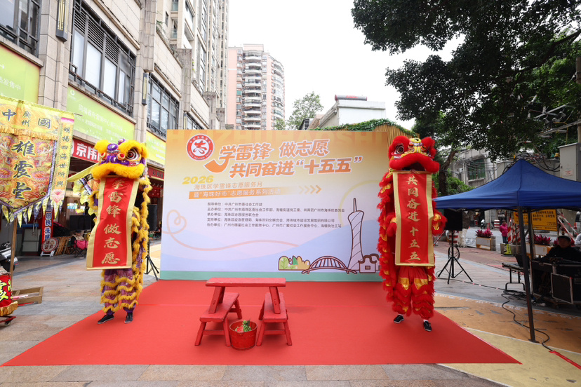 3月4日下午,广州市海珠区海幢街邻里志愿广场上人头攒动,暖意融融。随着一阵激昂的锣鼓声,2026年海珠区学雷锋志愿服务月暨“海珠好市”系列活动在此拉开帷幕。本次活动由海珠区委社会工作部、海幢街道党工委、团区委联合主办,以“学雷锋 做志愿 共同奋进‘十五五’”为主题,将传统的志愿精神与鲜活的社区生活融为一体,为市民献上了一场既有温度又有实效的志愿服务盛宴。