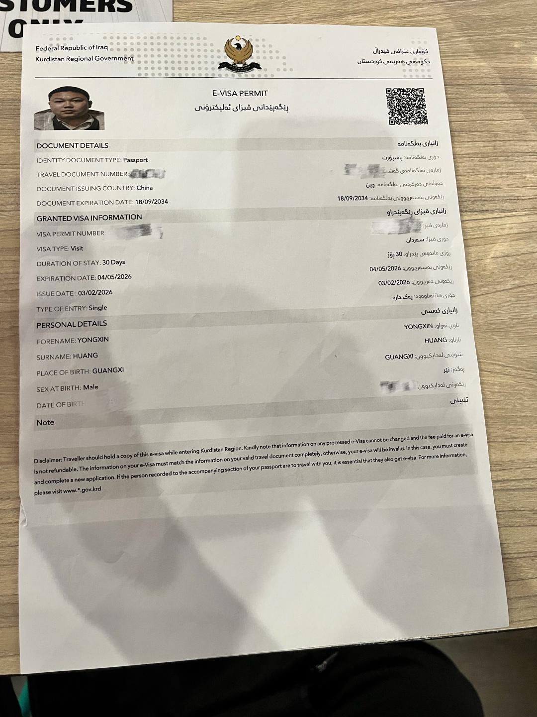 黄勇鑫临时办的签证