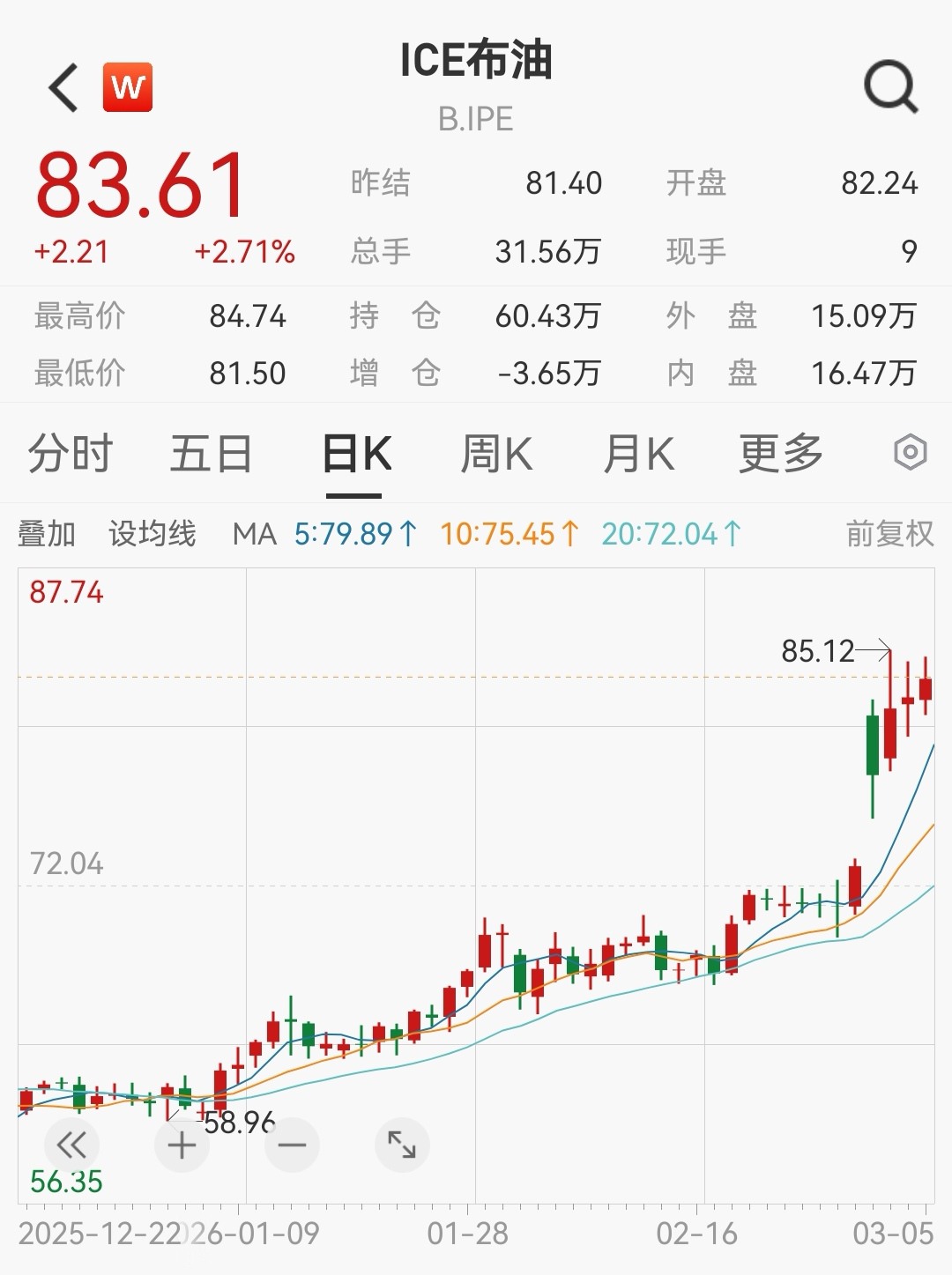 3月5日,布伦特原油价格欧洲时段交投82.5美元/桶附近,较前期高点有所回落。3月以来,布伦特原油累计上涨显著。