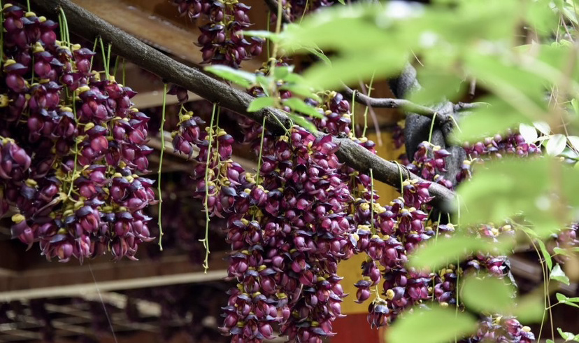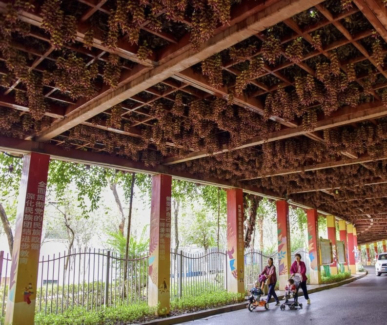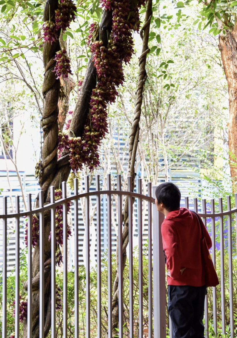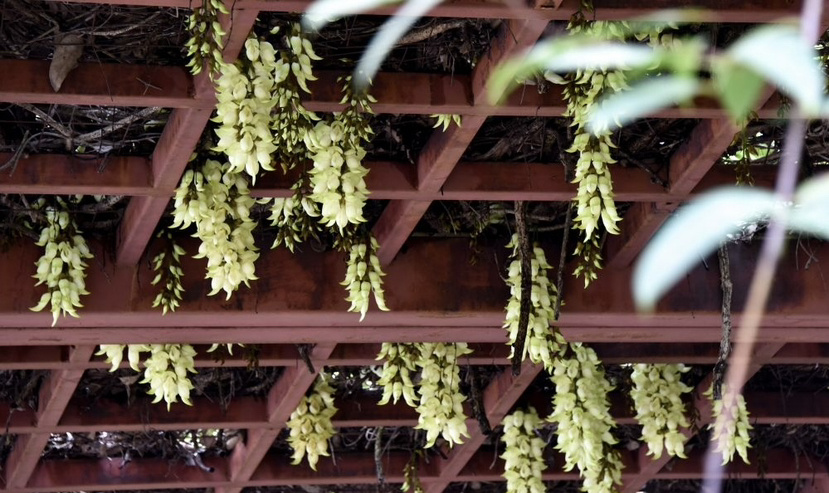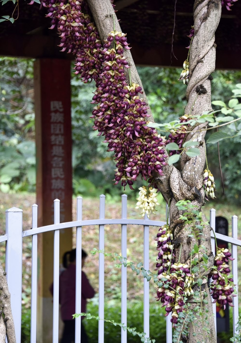步入公园,来到民族文化长廊,最具特色的莫过于那一串串禾雀花。它们或簇拥于粗壮的藤蔓之上,或垂挂在廊架梁檐之间。细看之下,朵朵花儿形态逼真:有的呈淡绿与嫩白相间,清雅脱俗;有的则透着深紫渐染绛红的色彩,热烈而神秘。花瓣上还挂着晶莹的雨珠,更显娇嫩欲滴。当微风拂过,成串的花朵轻轻摇曳,宛如一群展翅欲飞的小禾雀,生动演绎着“满园‘鸟’语报春来”的诗意画面。
