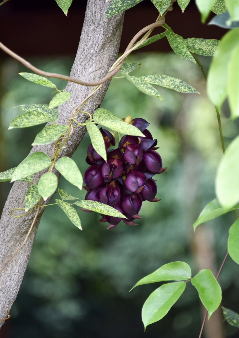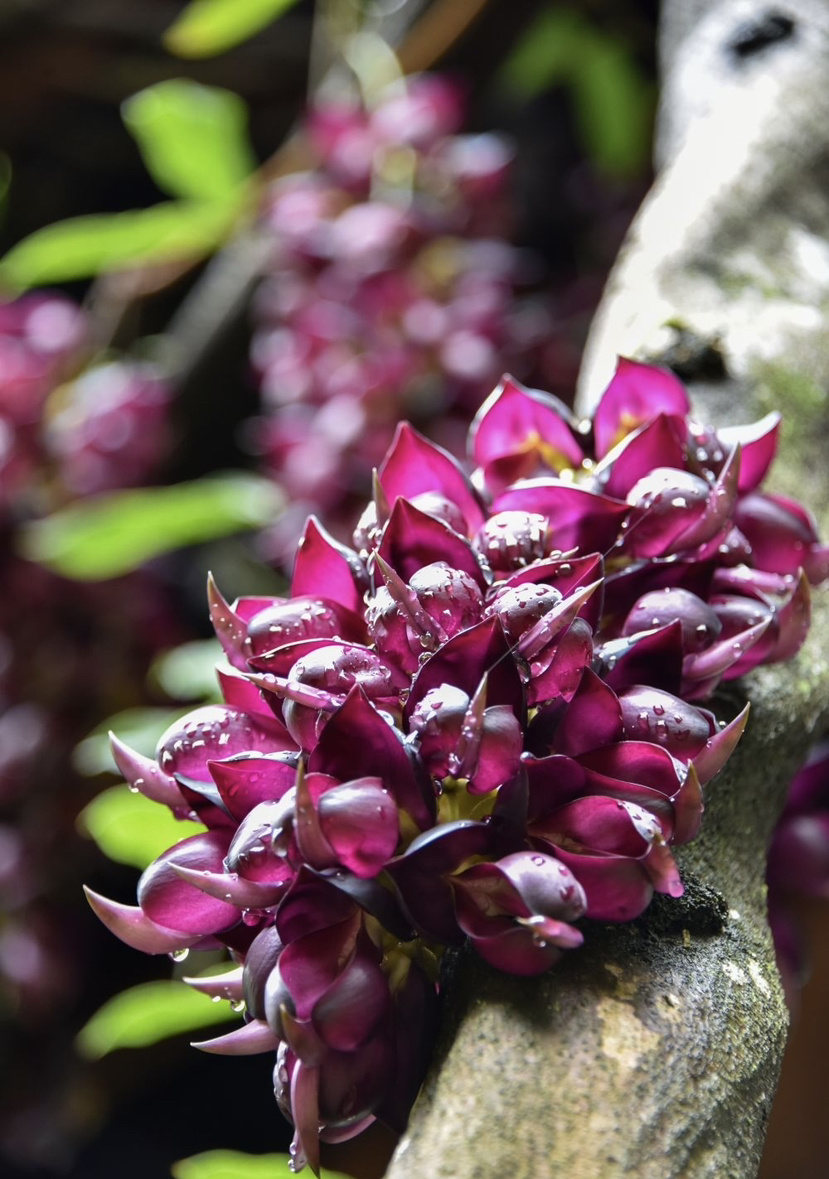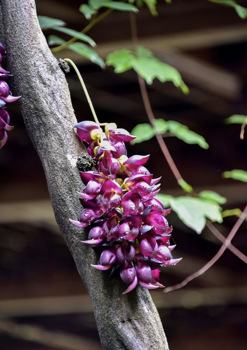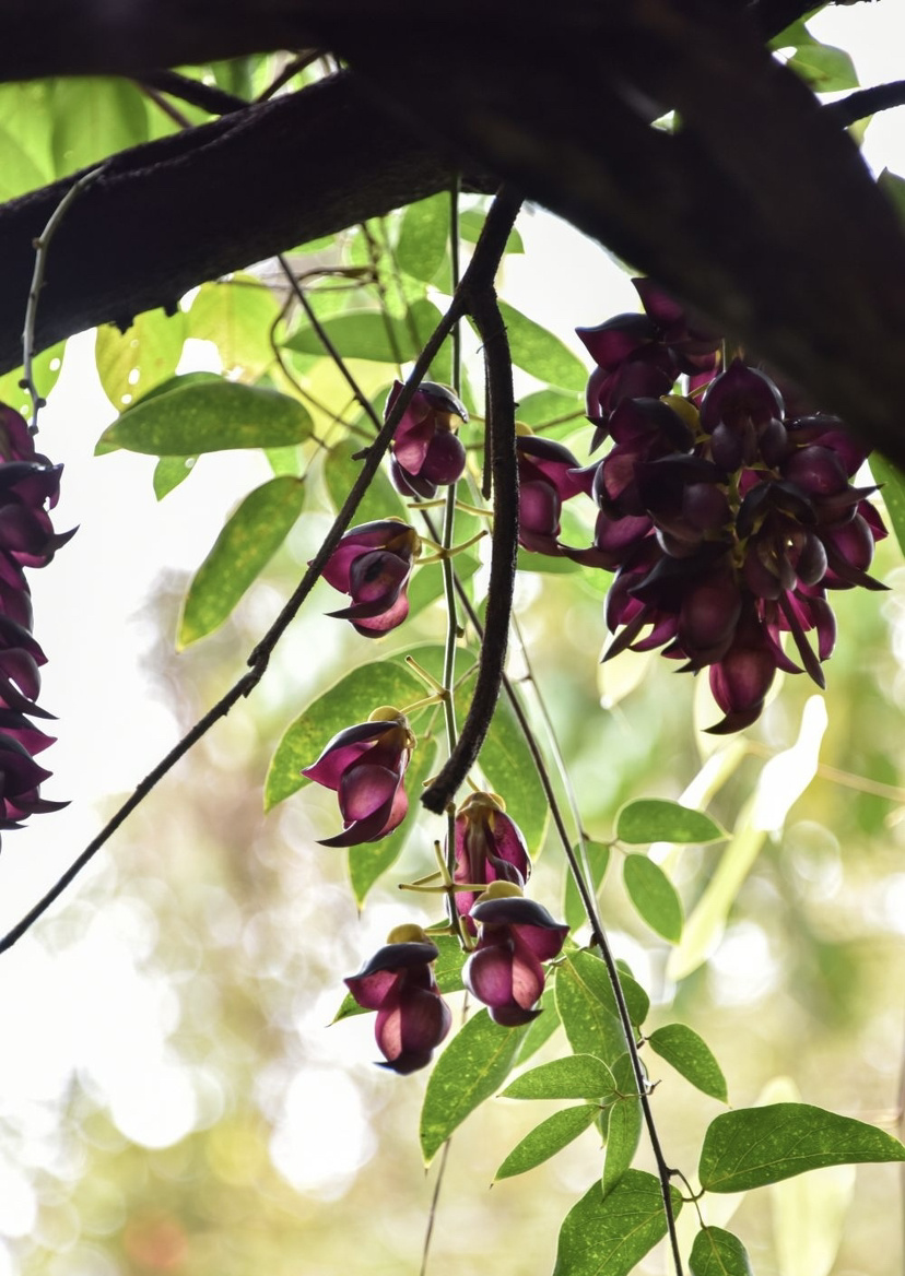 步入公园,来到民族文化长廊,最具特色的莫过于那一串串禾雀花。它们或簇拥于粗壮的藤蔓之上,或垂挂在廊架梁檐之间。细看之下,朵朵花儿形态逼真:有的呈淡绿与嫩白相间,清雅脱俗;有的则透着深紫渐染绛红的色彩,热烈而神秘。花瓣上还挂着晶莹的雨珠,更显娇嫩欲滴。当微风拂过,成串的花朵轻轻摇曳,宛如一群展翅欲飞的小禾雀,生动演绎着“满园‘鸟’语报春来”的诗意画面。