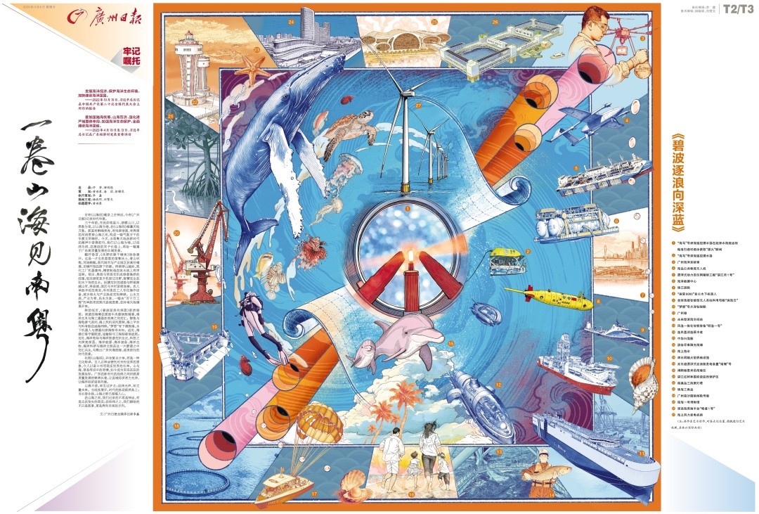 转动纸页,《碧波逐浪向深蓝》跃然眼前。深蓝的海潮在画面中央漩涡般铺展,海洋生灵与海工重器在浪涛之间交汇。鲸鱼与海龟游弋其间,海上风机迎风旋转,海上平台与科考船在远海列阵。“梦想”号下潜探海,水下机器人与潜器向深海探寻未知。远处,海港灯塔守望航道,运输船与工程船破浪远航;近处,海洋牧场与海洋旅游交织生长,科技之光照亮深蓝。海洋能源、海洋装备、海洋生物、海洋科研与海洋文旅在这一片蔚蓝之中交汇共生,勾勒出广东向海图强、逐浪前行的时代图景。