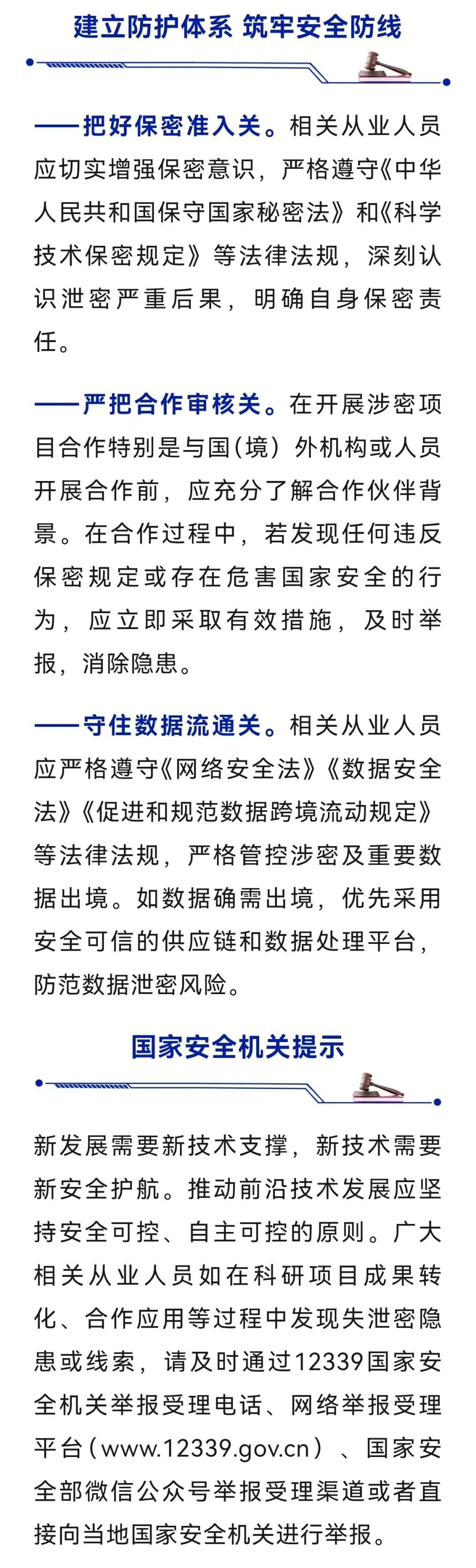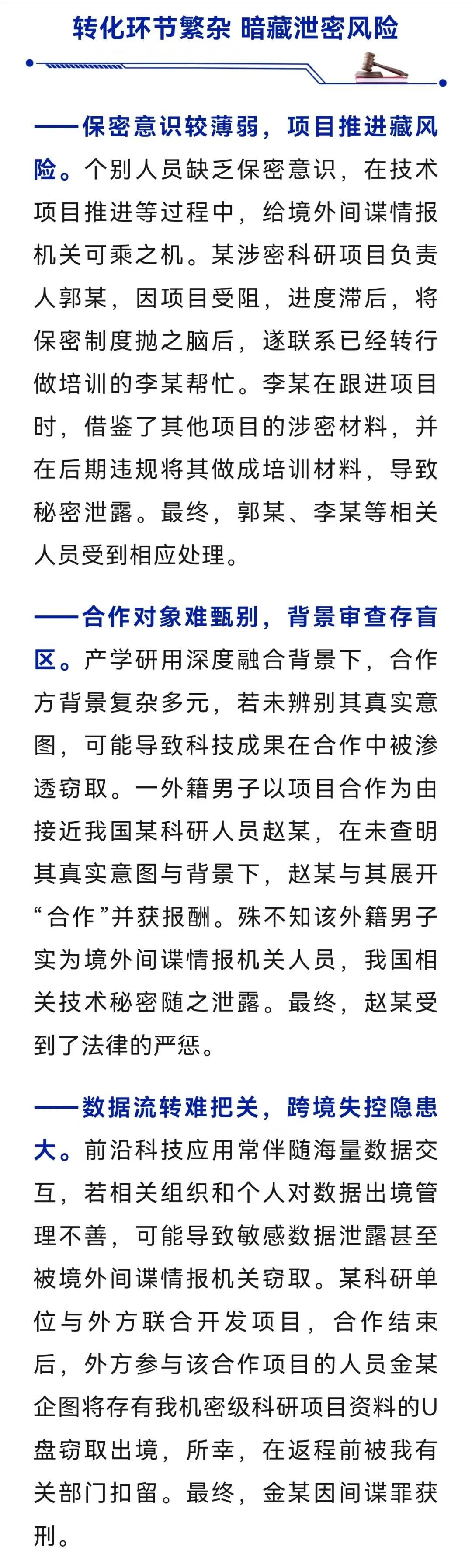 境外间谍情报机关企图在我前沿技术成果转化、合作应用的链条中寻找漏洞,窃取我高端技术秘密,给国家安全和社会稳定带来威胁和挑战。