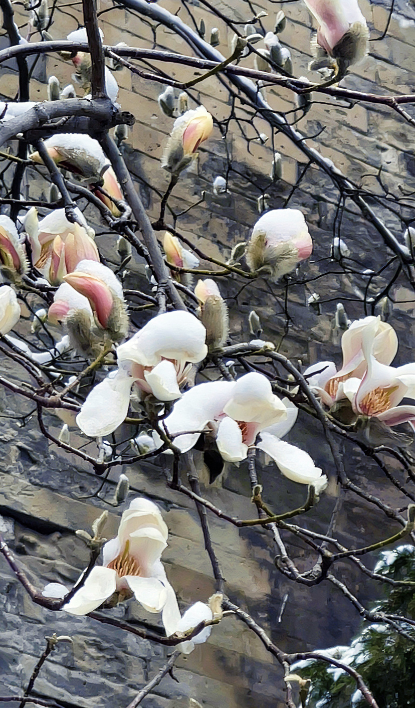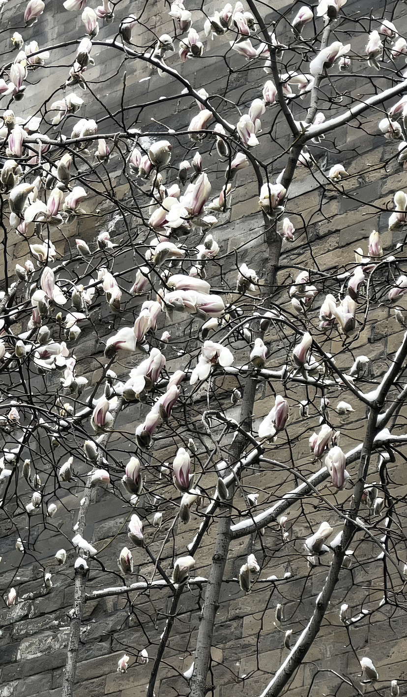 广州日报新花城记者在北京走访看到,当地玉兰多为含苞待放,枝干上缀满毛茸茸、笔头状的灰褐色花苞。前两日北京轻雪飘落,寒雪轻覆枝头,偶有玉兰迎雪初绽,素白花瓣映着清雪,冰清玉洁,清冷动人;待雪霁放晴,暖阳洒落,花苞更显温润饱满,在初春光影里别具含蓄雅致。
