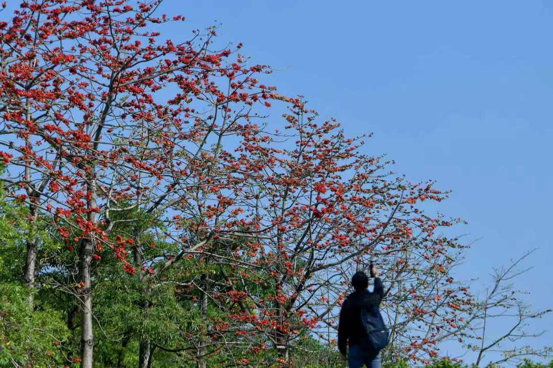 在这个明媚的春天,当然少不了广州市花木棉花。开发大道、香雪三路、开创大道、市民广场、创业公园等地均栽有木棉树。眼下,木棉花正花红似火,成为春日里最具辨识度的一道风景。